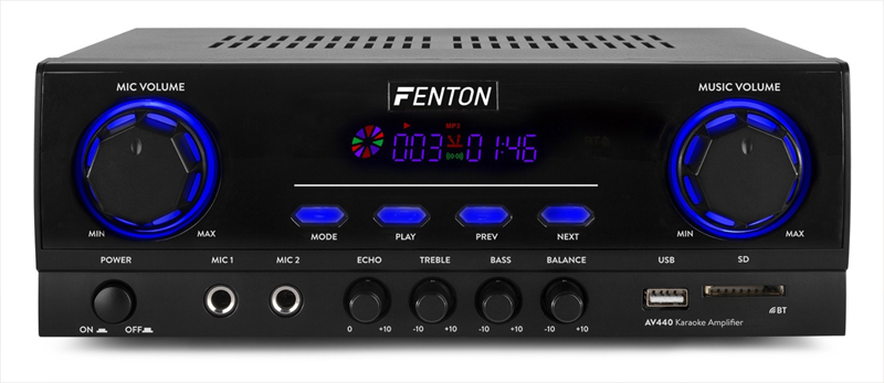 AV440 je moderno dvokanalno karaoke pojačalo snage 2x 200 W opremljeno multimedijskim playerom i plavo osvijetljenim tipkama. Opremljeno je daljinskim upravljačem, dva mikrofonska ulaza s kontrolom tona za karaoke primjenu, kontrolom jeke i dinamičkim prikazom na zaslonu. Također je savršeno za primjenu kao HiFi i pozadinska glazba.