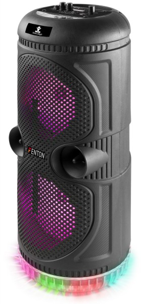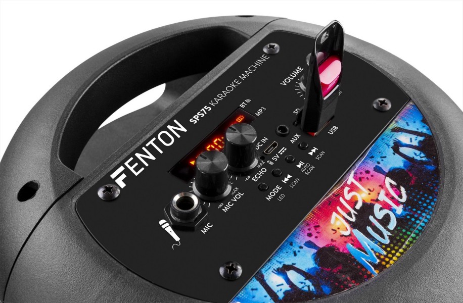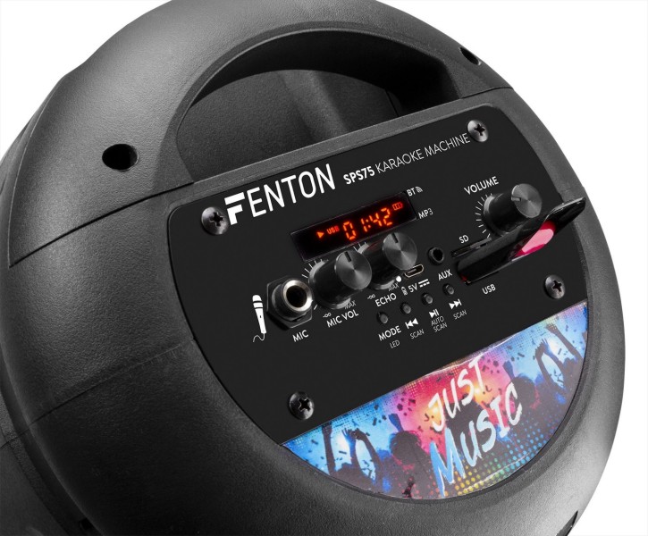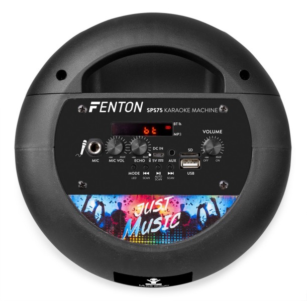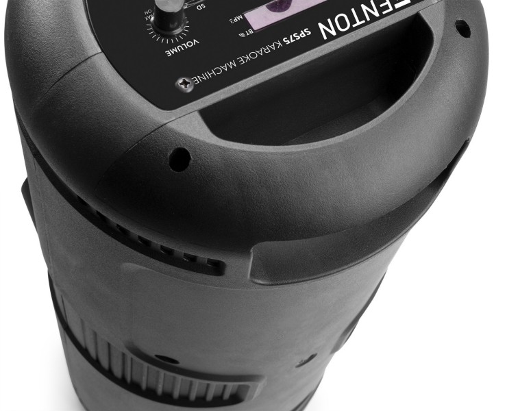 Započnite zabavu s karaoke uređajem SPS75! Ovaj okrugli sustav za zabavu “sve u jednom” opremljen je kako bi vam pružio besprijekorno bežično glazbeno iskustvo, zahvaljujući naprednoj bežičnoj BT tehnologiji. S ugrađenom punjivom baterijom, mikrofonom i brojnim opcijama ulaza; USB-om, micro SD karticom i ugrađenim priključkom za mikrofon, možete pjevati uz sve svoje omiljene pjesme. Upečatljiva bljeskajuća svjetla na vrhu i ispred dva 6,5-inčna zvučnika te spektakularno UFO svjetlo na dnu čine ga izvrsnim za kućnu zabavu, karaoke, škole, seminare ili mnoge druge primjene.