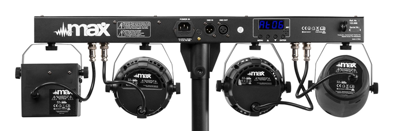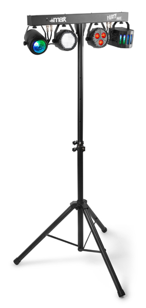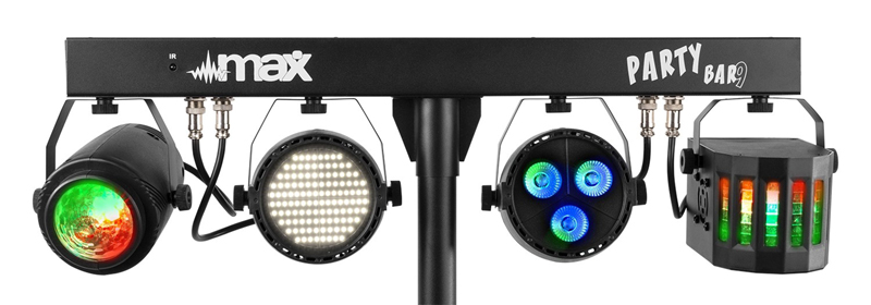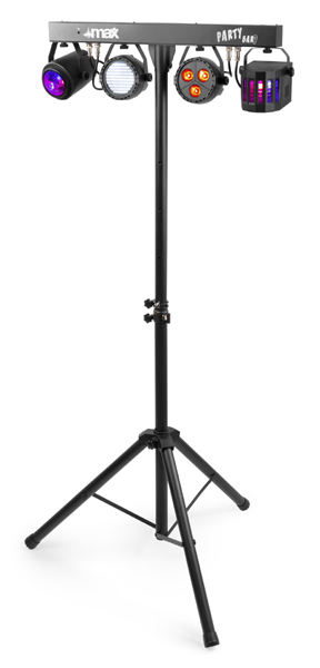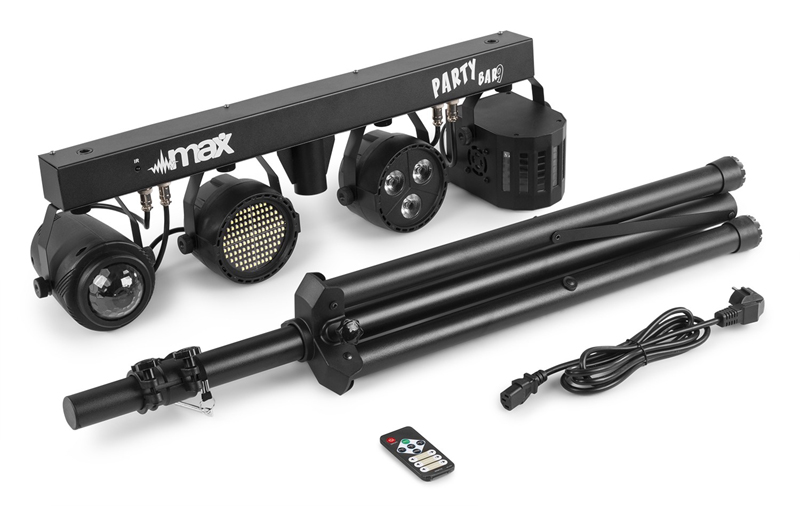 Tronios MAX PARTYBAR09 SET JELLY MOON, DERBY, PAR I STROBE 1 PAR 3x 3W 4-u-1 LED diode 1 Jelly Moon 4x 3W 4-u-1 LED diode 1 Derby 4x 1W 4-u-1 1 Stroboskop 120x SMD LED dioda RGBW Miješanje boja LED diode dugog vijeka trajanja (nazivno otprilike 50 000 sati) 3 ili 15 DMX kanala DMX i samostalni način rada IR daljinski upravljač DMX ulaz/izlaz putem 3-pinskog XLR-a Unaprijed programirane emisije Aktivacija zvukom s podesivom osjetljivošću Automatski način rada s podesivom brzinom LED zaslon s 4 tipke na stražnjoj ploči Uključeni stalak za svjetlo maksimalne visine 1,8 m