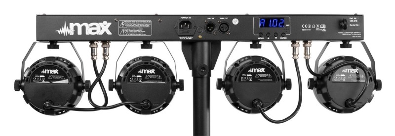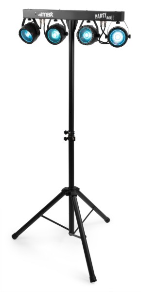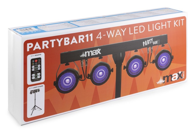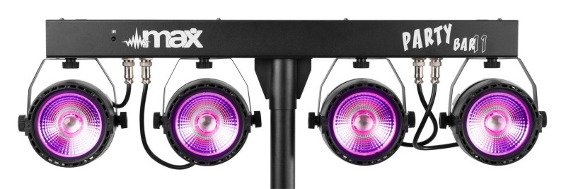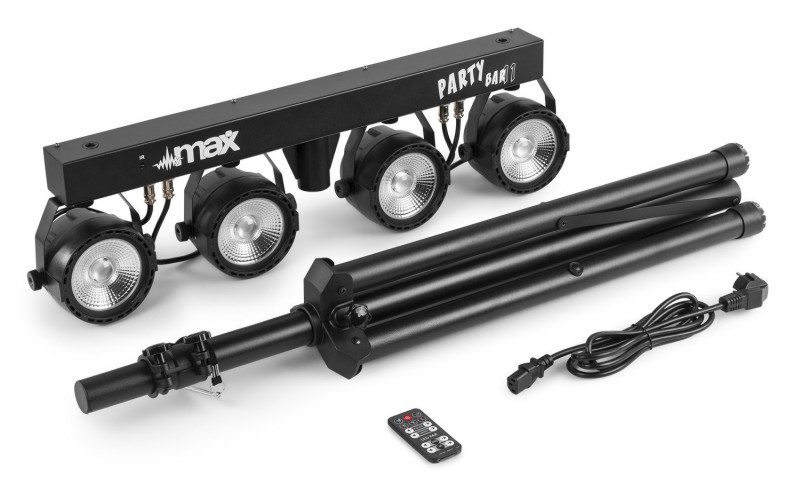 Tronios MAX PARTYBAR11 SET 4 X COB PAR 20W 4-smjerni komplet s 4x 20W 3-u-1 COB LED diode RGB miješanje boja LED diode dugog vijeka trajanja (nazivno na približno 50 000 sati) 7 DMX kanala DMX i samostalni način rada 0 – 100% linearno zatamnjenje IR daljinski upravljač DMX ulaz/izlaz putem 3-pinskog XLR-a Unaprijed programirane emisije Aktivacija zvukom s podesivom osjetljivošću Automatski način rada s podesivom brzinom LED zaslon s 4 tipke na stražnjoj ploči Uključeni stalak za svjetlo maksimalne visine 1,8 m