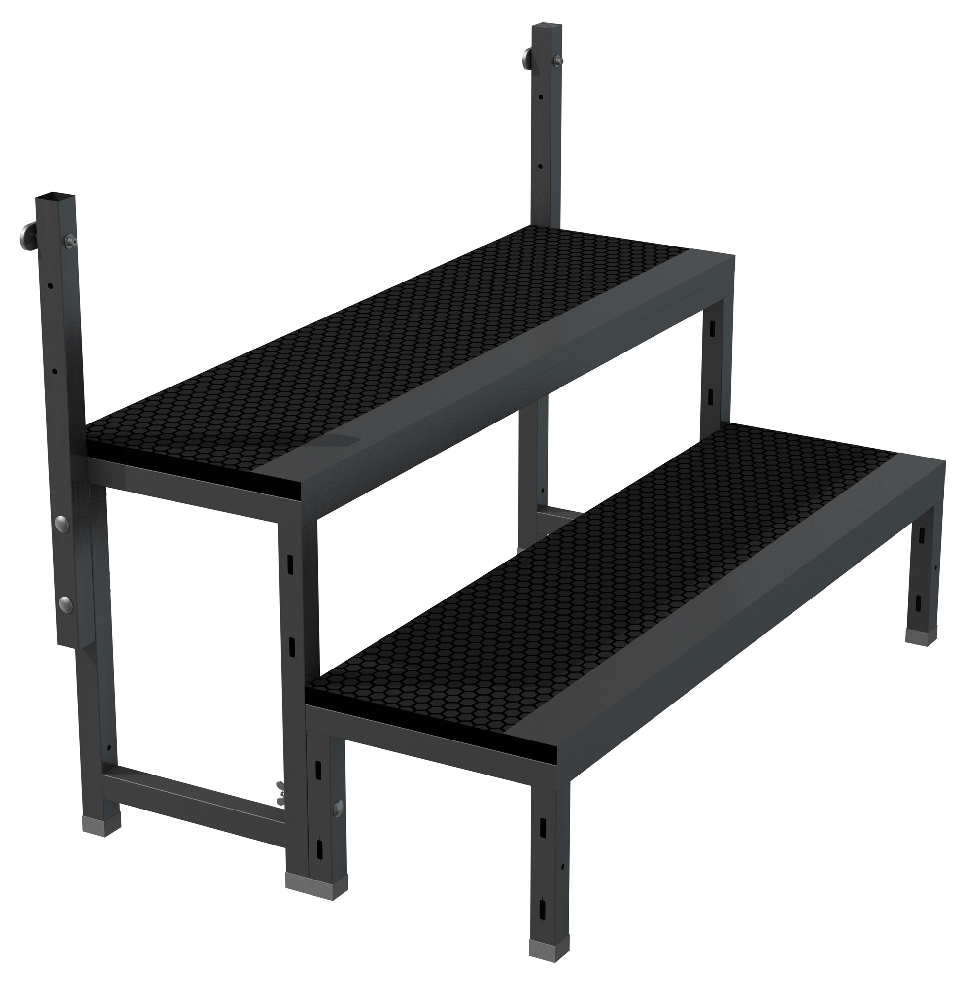 Modularne stepenice sa svim stepenicama iste visine, dostupne u četiri različite visine. Stepenice imaju podesive noge koje omogućuju postavljanje i niveliranje stepenica na neravnim površinama. Stepenice su zavarene od čeličnih profila, stepenice su izrađene od šperploče i imaju naš poseban “Hexa” protuklizni premaz kako bi se osiguralo maksimalno prianjanje, što ih čini pogodnima za unutarnju i vanjsku upotrebu.