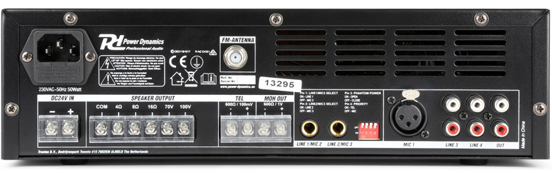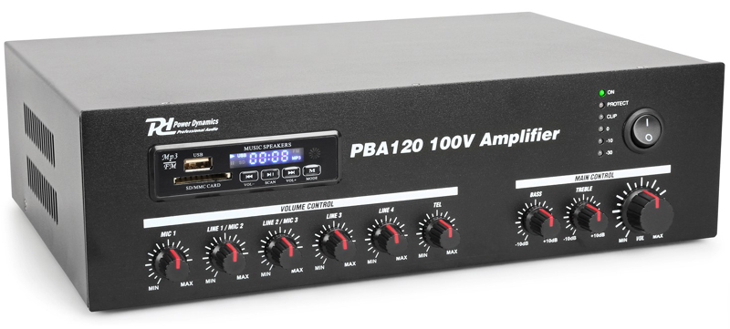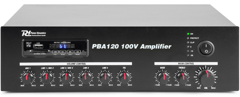 120W PA pojačalo MP3 player s USB i SD utorom BT prijemnik za audio streaming Ugrađeni ekvilajzer s unaprijed postavljenim postavkama IR daljinski upravljač 100V / 70V ili 16, 8, 4 Ohma kontrola basa i visokih tonova Balansirani mikrofonski ulaz s prioritetom 2 mikrofonska/linijska ulaza (6,3 mm priključak) 2 stereo linijska ulaza (RCA) Stereo RCA linijski izlaz Telefonski ulaz MOH izlaz