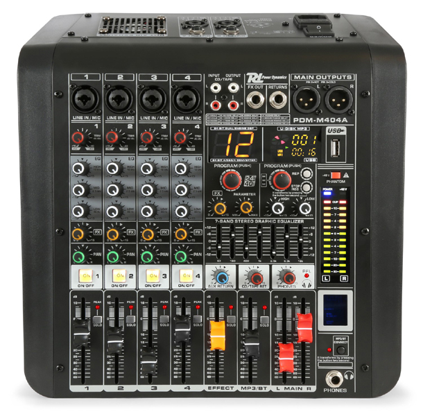 Tronios Power Dynamics PDM-M404A 4-KANALNI GLAZBENI MIXER S POJAČALOM 4 balansirana mono mikrofonska/linijska ulaza (Combi XLR/Jack) +48V fantomsko napajanje Stereo linijski ulaz (RCA) Multi-FX procesor sa 16 unaprijed postavljenih postavki Solo prekidač po kanalu (PFL) Prekidač za uključivanje/isključivanje po kanalu Kontrola visokih, srednjih i niskih tonova za svaki kanal Podesivi FX, panorama, trim po kanalu Stereo balansirani glavni izlazi (XLR) Odvojeni izlazi za slušalice i stereo snimanje 7-pojasni ekvilajzer Ugrađeno 2x 200W RMS pojačalo Ugrađeni USB player s digitalnim zaslonom BT-prijemnik za audio streaming LED VU mjerač i Peak LED diode