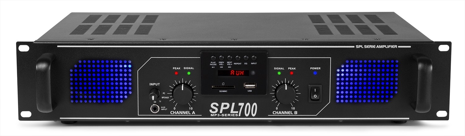 Ovo pojačalo od 2x 350 W ne bi smjelo nedostajati nijednom DJ setupu. S ugrađenim MP3 playerom, jednostavno reproducira MP3 glazbu s USB sticka ili SD kartice. Plava LED osvijetljena moderna prednja ploča. Pojačalo se može spojiti na razne izvore, sprijeda ima 3,5 mm priključak za MP3 player, telefon itd., a na stražnjoj strani su tri stereo RCA ulaza za primjerice računalo, televizor, DVD player itd.