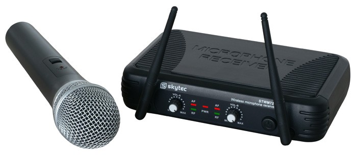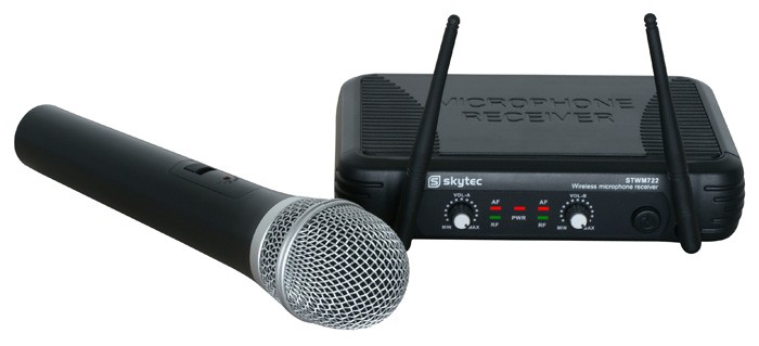 Tronios SKYTEC STWM722C 2-kanalni UHF bežični mikrofonski sustav Dvokanalni UHF bežični mikrofonski sustav s antenom-diversity koji uključuje ručni mikrofon i bodypack odašiljač s mikrofonom za slušalice. Oba odašiljača rade na različitim frekvencijama. Dobra kvaliteta zvuka i pouzdanost zahvaljujući tehnici diversityja. Idealan za pozornicu, vokale, prezentacije itd.