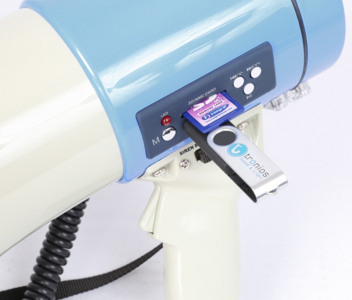 Snažan megafon s USB priključkom i SD utorom, litijeva baterija, MP3 upravljačka ploča, ugrađeno pojačalo od 65 W i odvojivi mikrofon s anti-feedbackom i spiralnim kabelom. Funkcija sirene, kontrola glasnoće i podesivi remen za rame. Domet 1,0 – 1,2 km ovisno o uvjetima rada.