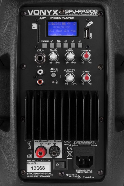 Tronios VONYX SPJ-PA908 Mobilno Pojačalo ABS 8″ BT/UHF/USB/MP3 Profesionalni 8″ mobilni zvučni set snage 350 W s BT prijemnikom za streaming zvuka na pojačalo, s bežičnim UHF mikrofonskim sustavom, daljinskim upravljačem i integriranim USB i SD utorima za reprodukciju MP3 datoteka. Ovaj višenamjenski sustav radi putem mreže ili 12V interne punjive baterije od 3Ah. Na stražnjoj strani nalaze se ulazi za žičani mikrofon, AUX linijski ulaz, MP3 upravljačka jedinica, kontrola basa/visokih tonova itd.